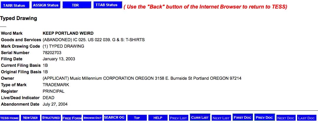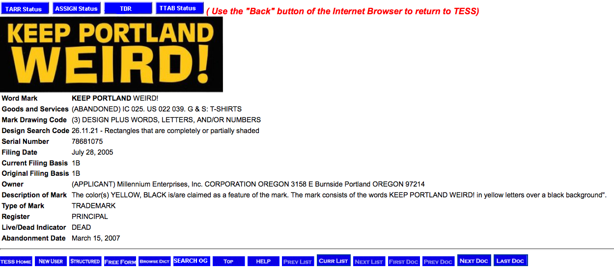 Music Millennium tried twice to obtain a federal registration for the KEEP PORTLAND WEIRD mark, but was rejected both times by the USPTO based on a prior trademark registration for KEEP AUSTIN WEIRD. The “Keep _____ Weird” phrase apparently originated in Austin, Texas (from Red Wassenich, who says he made the comment after giving a pledge to an Austin radio station), and the federal registration claims a date of first use of October 1, 2001. Check out the Austin registration and Music Millennium’s federal application attempts below: