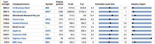 Ranked at #9 overall, Digimarc has the highest Industry Impact score in the top 50. According to The Wall Street Journal, Industry Impact indicates the extent to which others are building upon a portfolio of issued US utility patents as compared to the total set of utility patents in the industry. As the chart below indicates, Digimarc maintains far less patents than most companies on the list, but those patents they do hold are extremely valuable.
