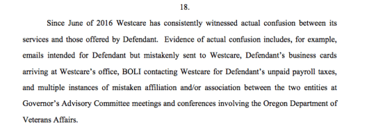 The plaintiff in this lawsuit, Westcare, is a Salem, Oregon-based provider of management services to long-term care facilities. Plaintiff claims to have used their “Westcare” mark since 1987. Plaintiff obtained a federal trademark registration in October 2017.